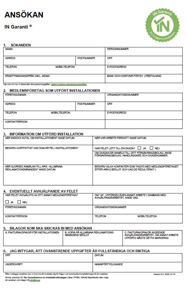 Ansökan skickas till: Installatörsföretagen, IN Garantinämnd, Box 17154, 104 62 Stockholm alternativt info@in.se (ange ”IN Garanti” i ämnesraden)