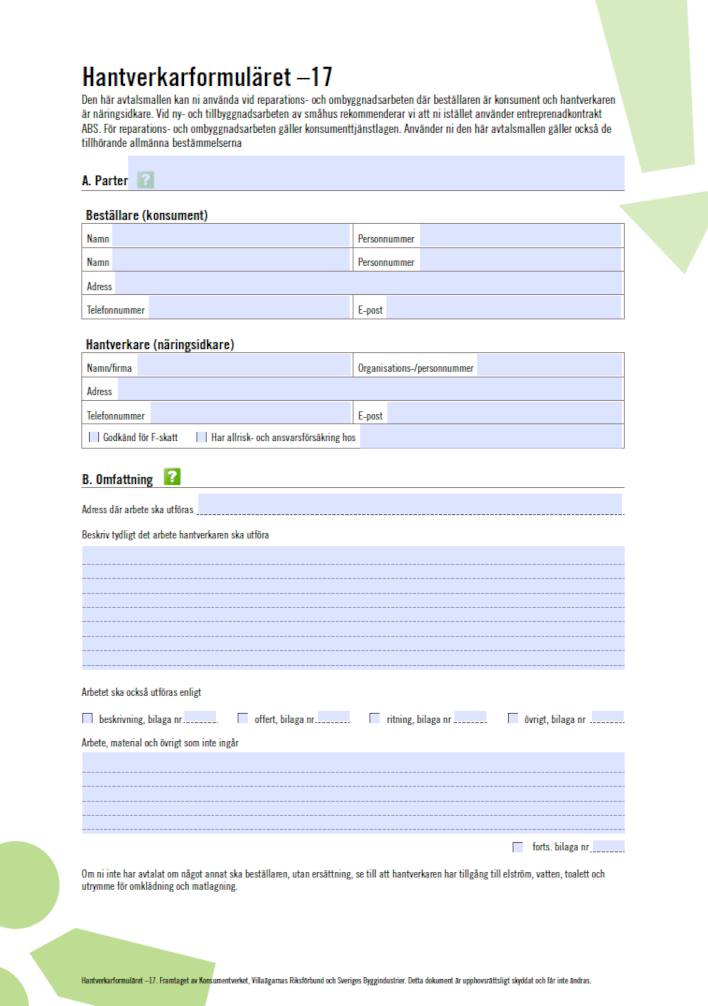 Hantverkarformuläret använder du när du skriver ett avtal med ett medlemsföretag inom Installatörsföretagen.