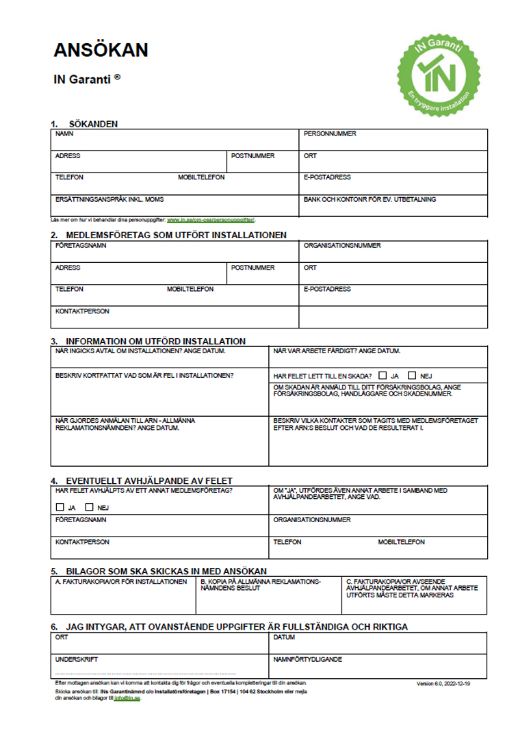 Det här formuläret använder du om du behöver ansöka om ersättning från IN Garanti.